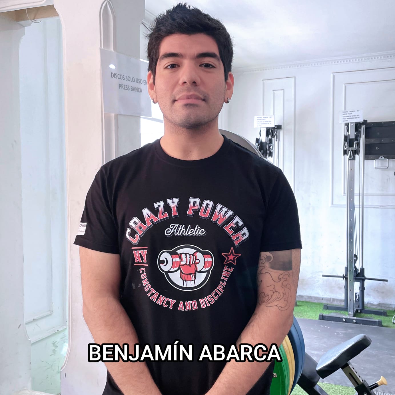 Benjamín Abarca es preparador físico en el gimnasio Crazy Power en Buin, Chile. Se ha formado como Técnico Superior en Preparación Física en Duoc UC, y cuenta con experiencia en entrenamiento personalizado y en la disciplina del boxeo, lo que le otorga una visión integral del rendimiento deportivo. Destaca por ser estructurado, servicial y comprometido con sus alumnos, cualidades que lo convierten en un entrenador muy valorado dentro de la comunidad Crazy Power. Su enfoque está en guiar a cada persona con atención, adaptando las rutinas según las necesidades individuales y supervisando de cerca la correcta ejecución de los ejercicios. Benjamín trabaja con pasión por el progreso de sus alumnos, siempre priorizando la seguridad, el respeto y el trabajo en equipo dentro del gimnasio.